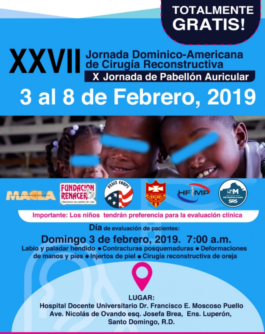 La Fundación Renacer y MACLA (Medical Aid for Children of Latin America) anuncian la XXVII Jornada de Cirugías Reconstructivas y la Jornada de Reconstrucción de Pabellón Auricular gratuitas para la población, del 3 al 8 de febrero 2019, en el hospital docente universitario Dr. Francisco E. Moscoso Puello, ubicado en el ensanche Luperón.