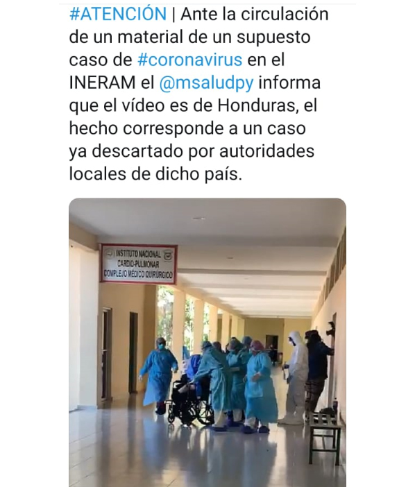 Con relación al video que circula, se explica que corresponde a otro centro de salud en otro país. Según el Ministerio de Salud Pública de Paraguay, las imágenes corresponden a un centro de Honduras.