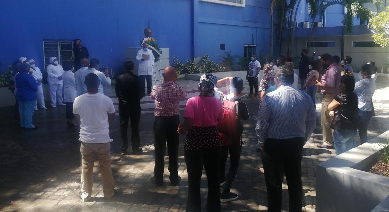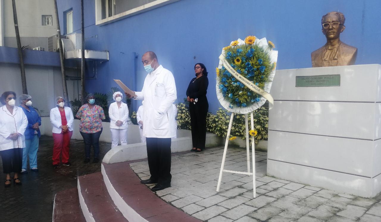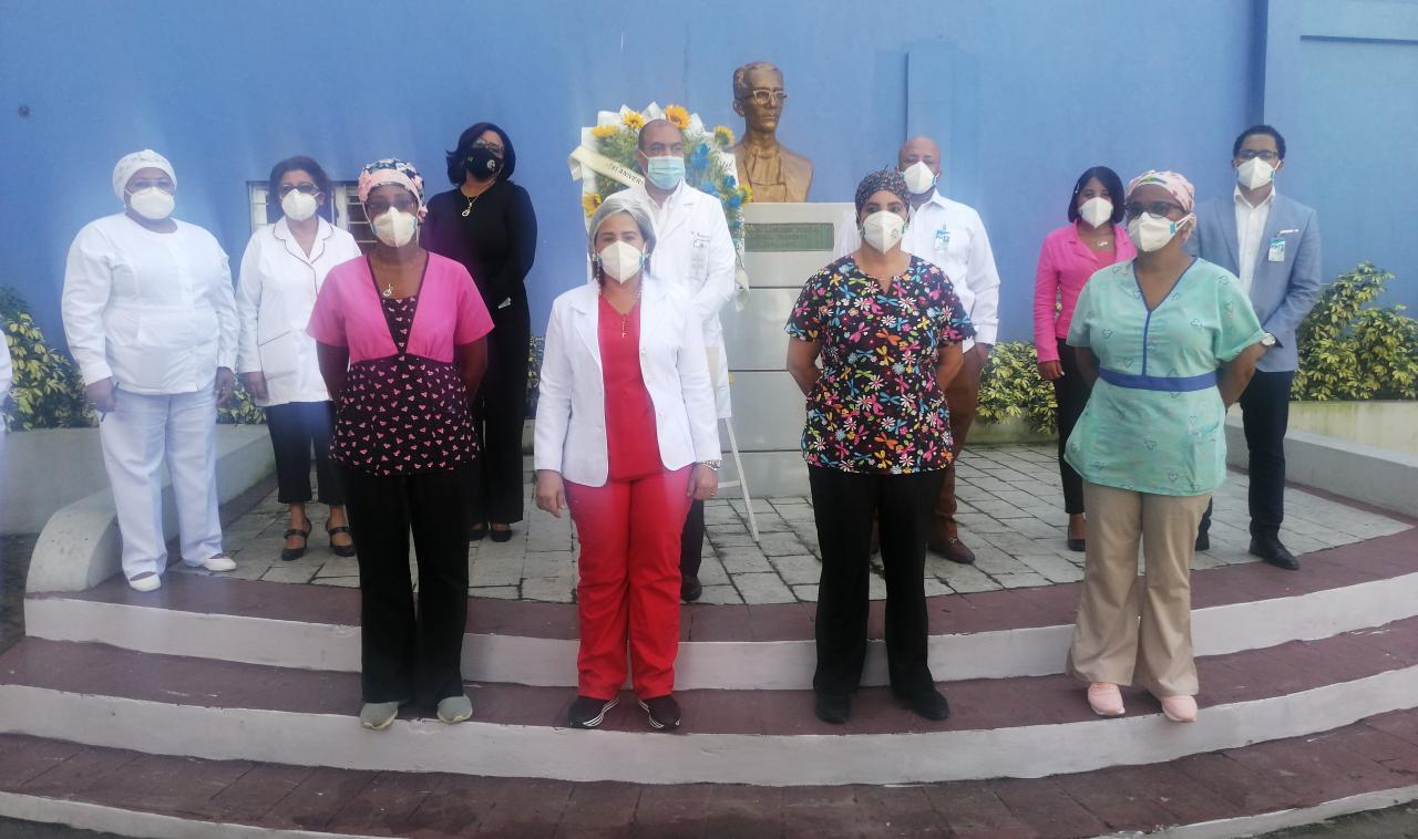 Durante el depósito este viernes de una ofrenda floral en el busto del fenecido médico, el director del hospital destacó la labor del personal médico, de enfermería, de servicios diagnósticos, de bioanalistas y administrativo de la Unidad Covid-19 que funciona en el centro por su compromiso en la lucha contra el Coronavirus.