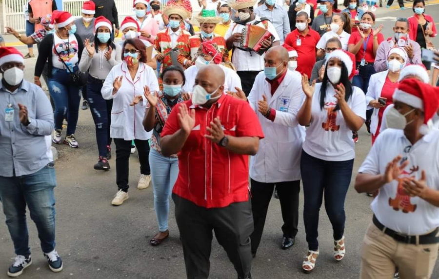 El hospital Moscoso Puello se vistió de fiesta este viernes al realizar el tradicional aguinaldo; los presentes llevaban atuendos de color rojo y accesorios navideños, pero con el artículo imprescindible: la mascarilla, así se sorprendieron a los usuarios con cánticos y música de la época.