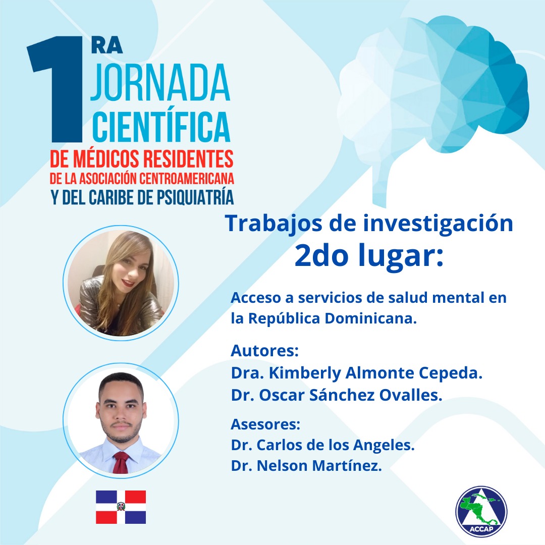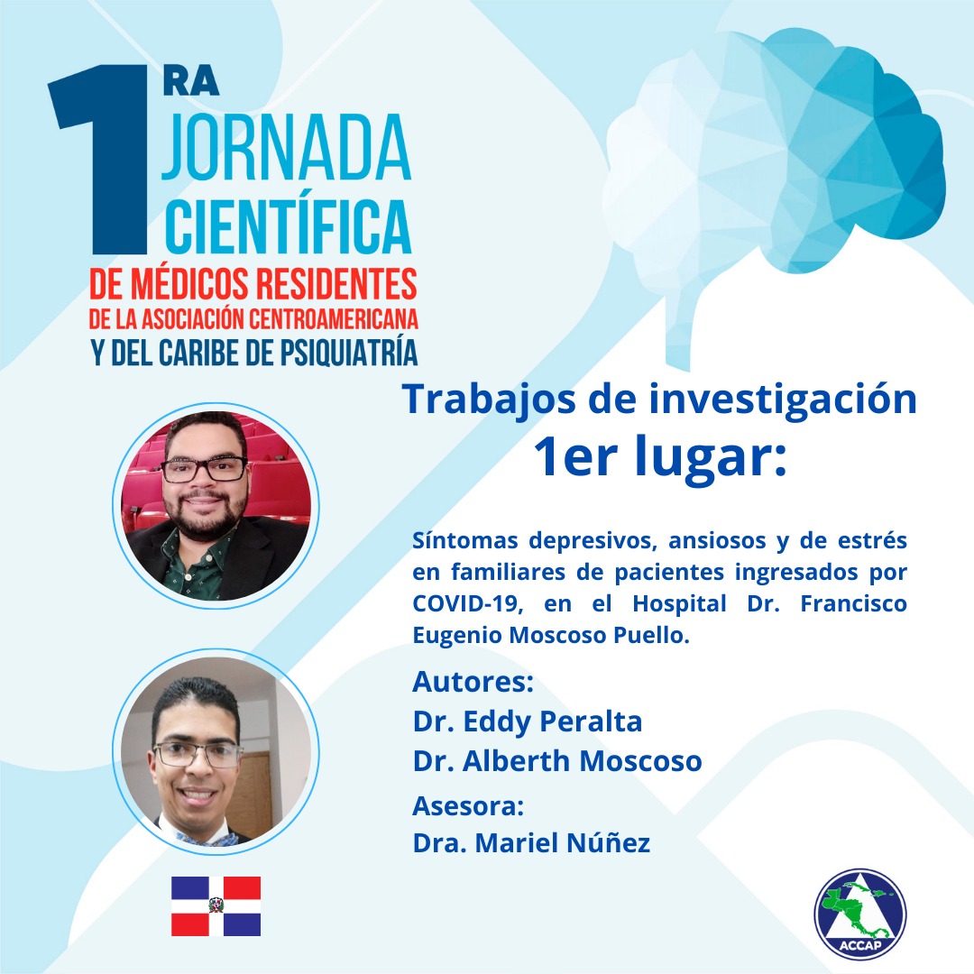 Médicos de la Residencia de Psiquiatría del hospital doctor Francisco Moscoso Puello obtuvieron reconocimientos a nivel internacional al alcanzar los tres primeros lugares en trabajos de investigación, presentados durante la Primera Jornada Científica de Médicos Residentes 2021, que organiza la Asociación Centroamericana y del Caribe de Psiquiatría (ACCAP) bajo la modalidad virtual.