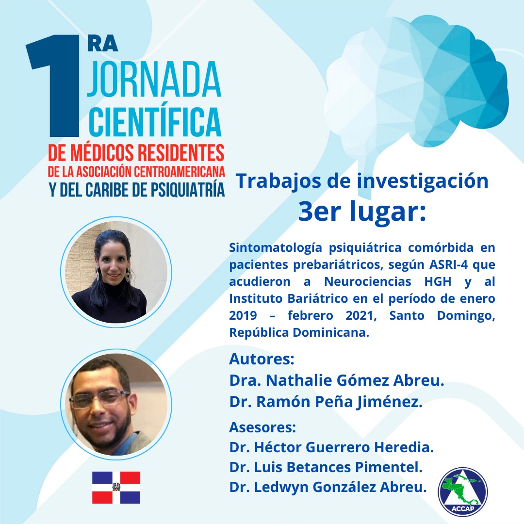 Los ganadores del primer lugar fueron los médicos en formación Eddy Peralta y Albert Moscoso con el trabajo: Síntomas depresivos, ansiosos y de estrés en familiares de pacientes ingresados por Covid; del segundo, Kimberly Almonte Cepeda y Óscar Sánchez Ovalles, con: Acceso a servicios de salud mental; y del tercero, Nathalie Gómez Abreu y Ramón Peña Jiménez, con: Sintomatología psiquiátrica comórbida en pacientes prebariátricos.